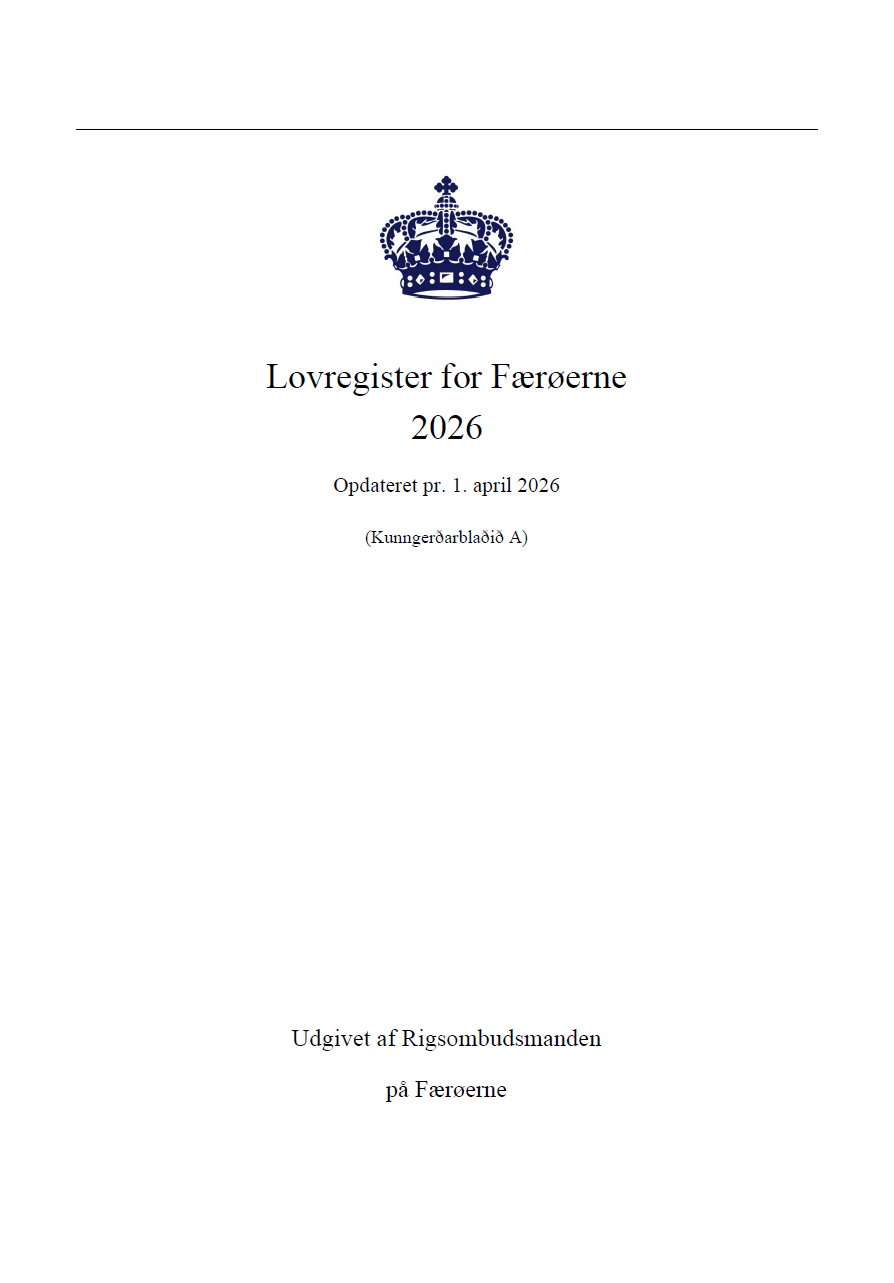 The register of legislation applicable to the Faroe Islands, Lovregister for Færøerne, is a continuation of Færøsk Lovregister, which was published by the Faroese Government and The High Commissioner’s Office in the Faroe Islands over a number of years. The register of legislation is updated quarterly.